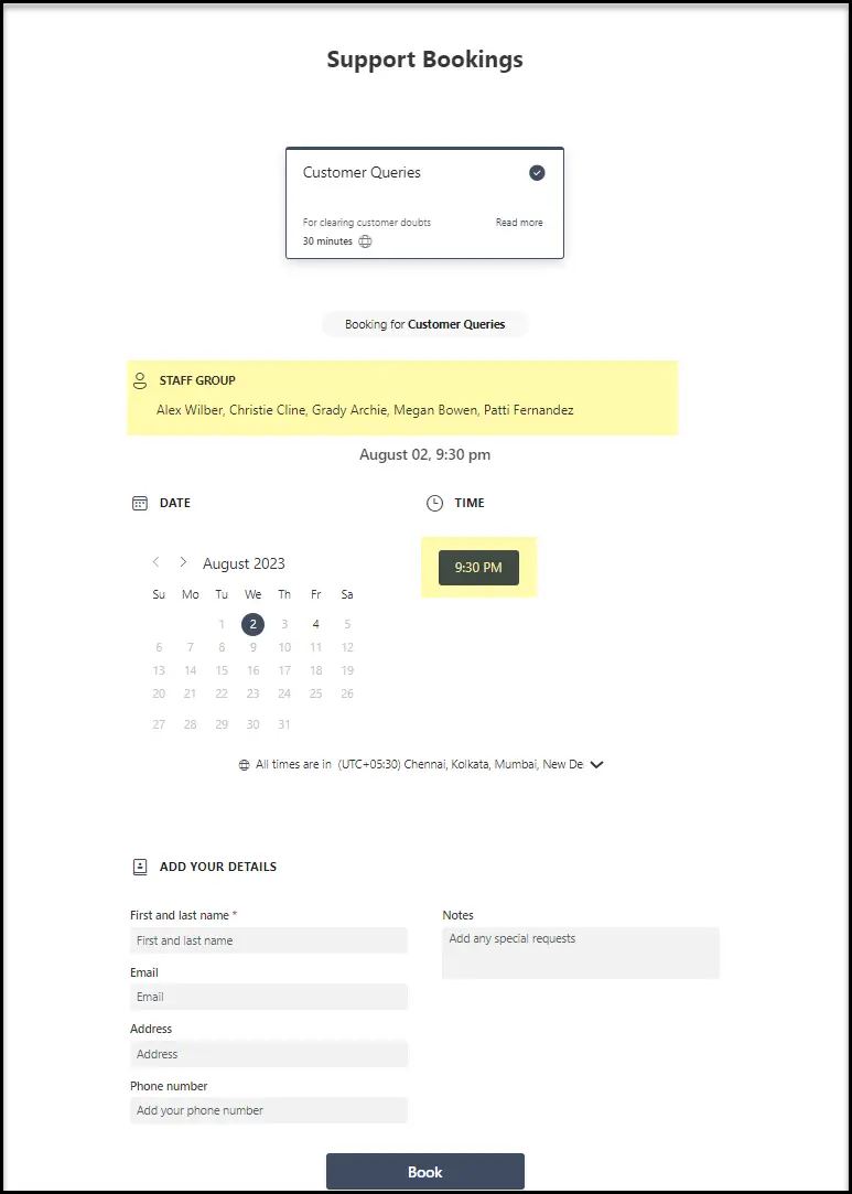This is how the booking page will look like : It shows only the time slots in which all the staff are available.