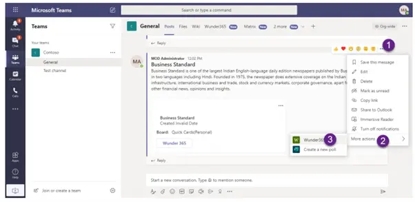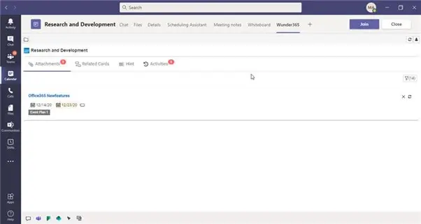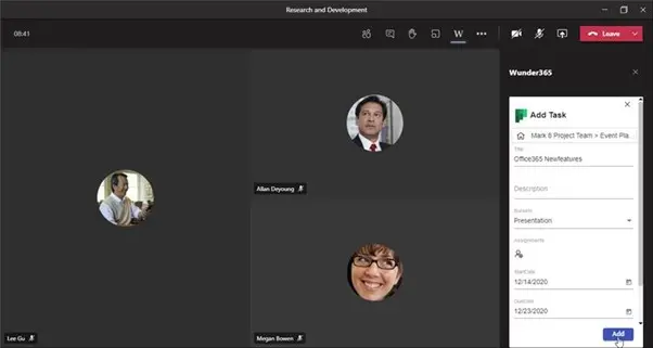 And you can directly access the add-in in the meeting side nav bar to create a Teams conversation, planner task, Wunder365 card, and SharePoint task directly.