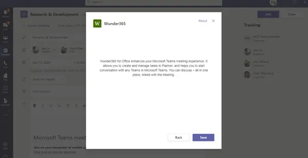 When scheduling a meeting for any of the users, the organizer can install Wunder365 directly as a tab in the meeting.