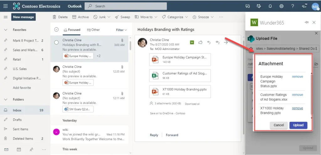 Wunder365 for Office add-in is a set of super connectivity apps that connects Outlook, Teams, Planner, SharePoint, OneNote, in Office 365 for better collaboration and helps you to save an email attachments in SharePoint library with just a single click.