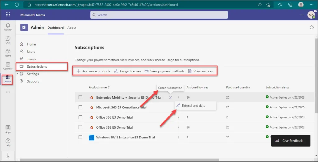 Users can view few of the major Billing features part of the Microsoft 365 admin center under ‘Subscriptions’. The key features included here are :