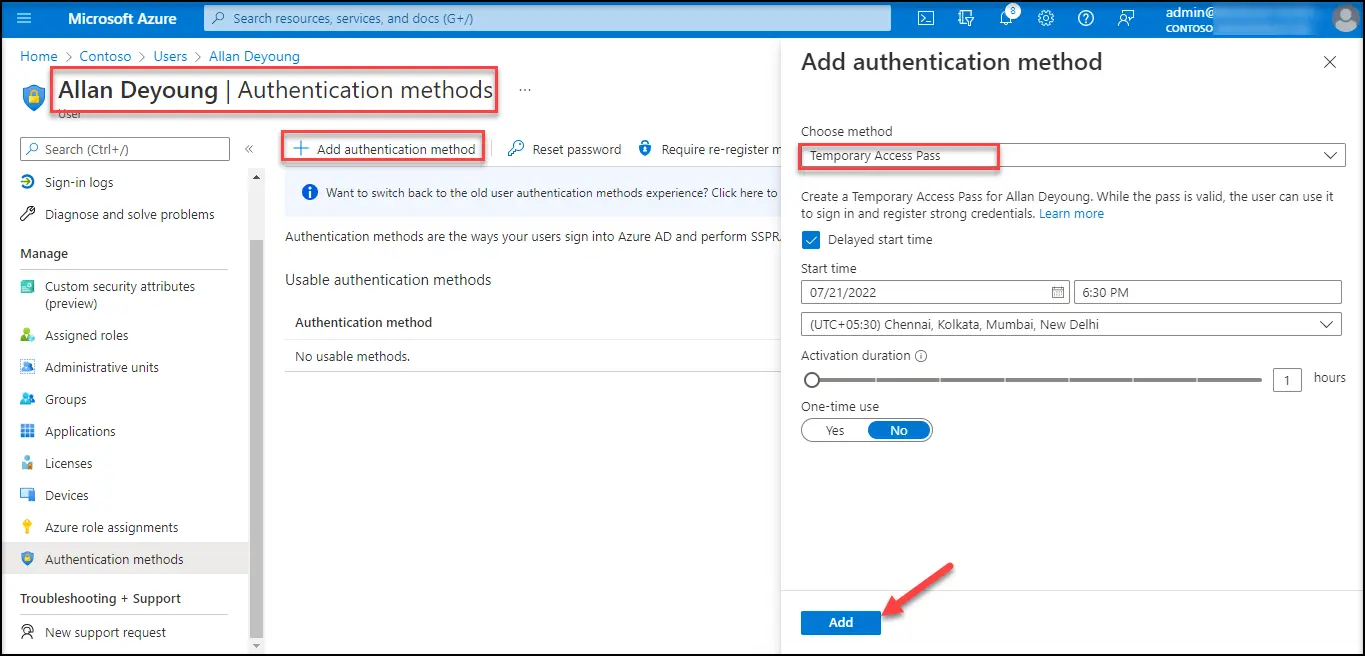 - Choose Temporary Access Pass over the dropdown “Choose method”.