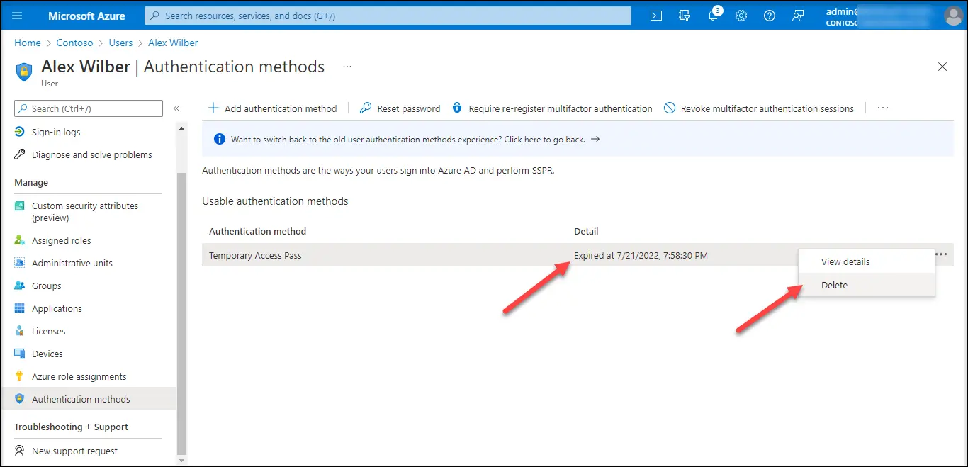 Once the Temporary Access Pass expires, admin can delete it under user -> Authentication Methods. The generated passes and their expiry time are listed – over which the admin can choose to delete the pass.