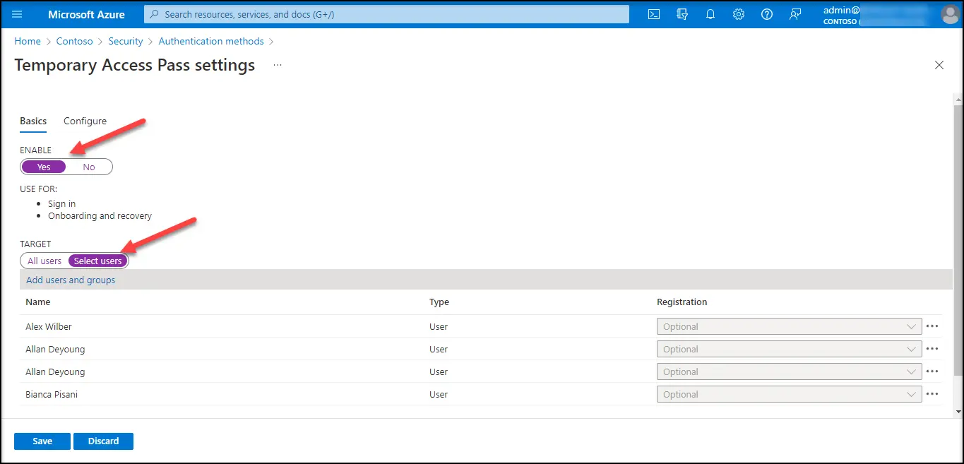 On the Configure tab, you can modify the default Temporary Access Pass settings, such as max/min lifetime, default lifetime, length & enable one-time usage. This step is optional and if you do not update, default values apply to all these parameters.